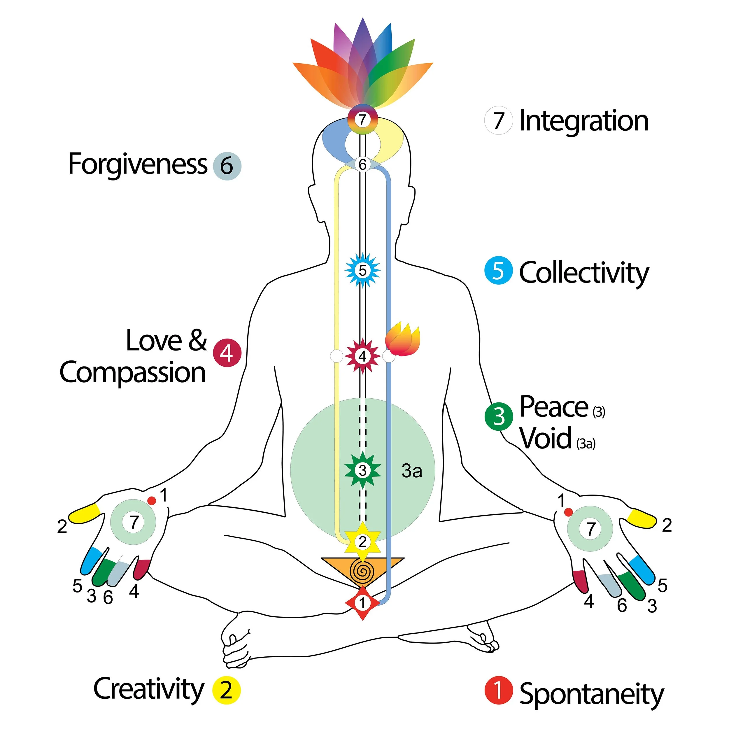| 6th Agnya | Forehead | Forgiveness, humility, surrender | Shri Jesus Christ, Shri Mary, The Lord's Prayer |